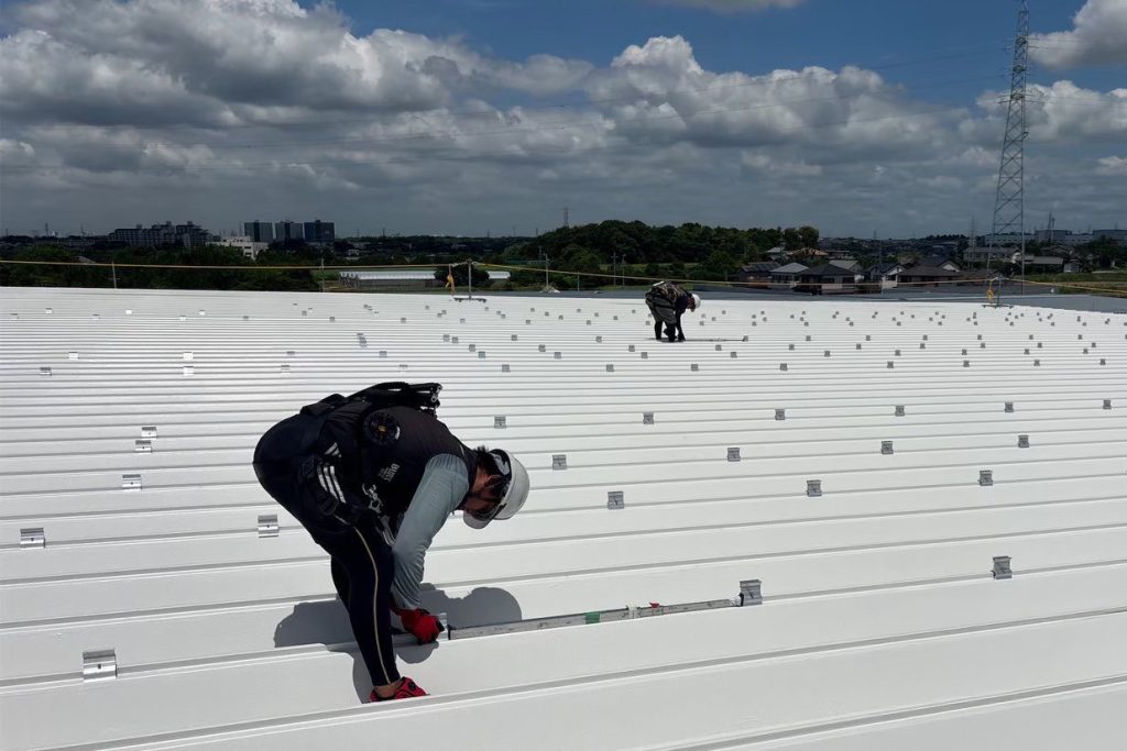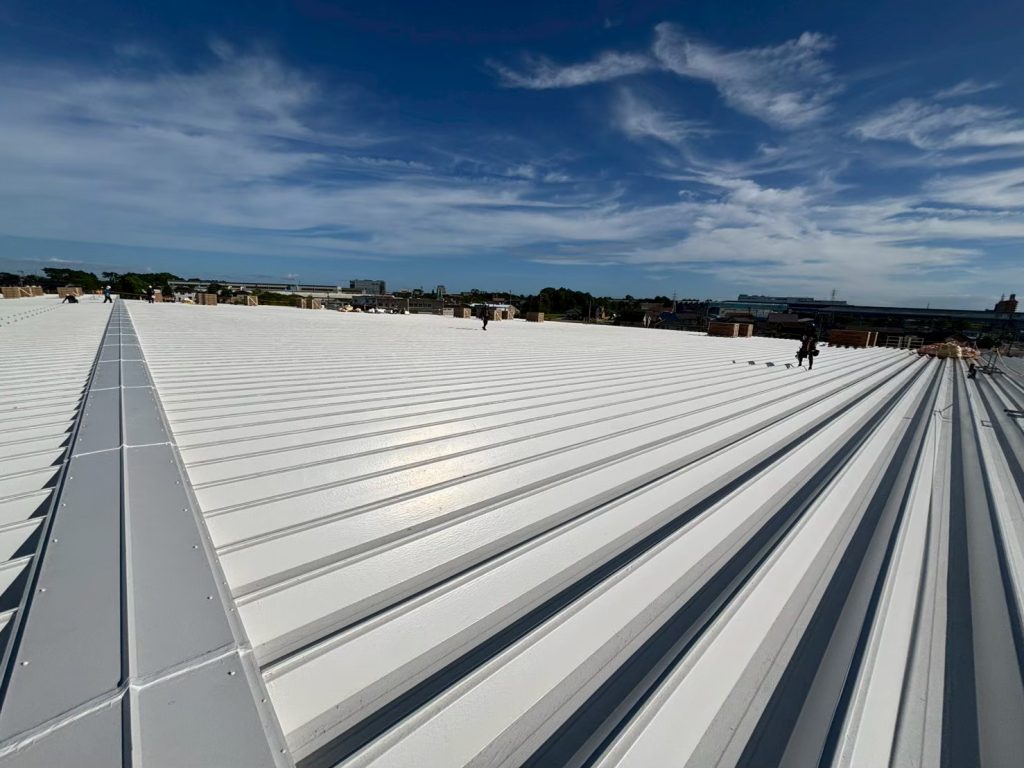 真夏の屋根上といえば普通は「地獄のような熱さ」ですが、ここは遮熱塗装のおかげで素手で触れるほど。ところが、その照り返しが凄すぎて、視界はまるでスキー場。全員サングラスが必須の作業となりました。