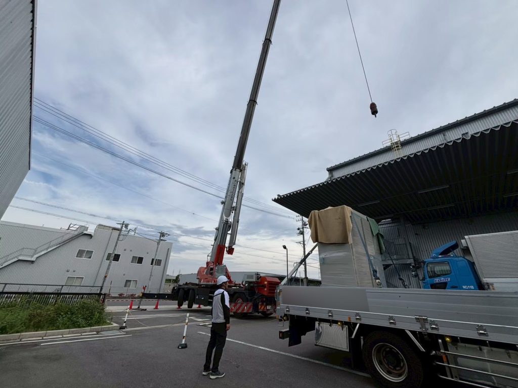 35mという距離と2.4tの重量を考慮し、クレーン屋さんと現地調査を重ねて100t級を選定。安全に作業を完遂しました。