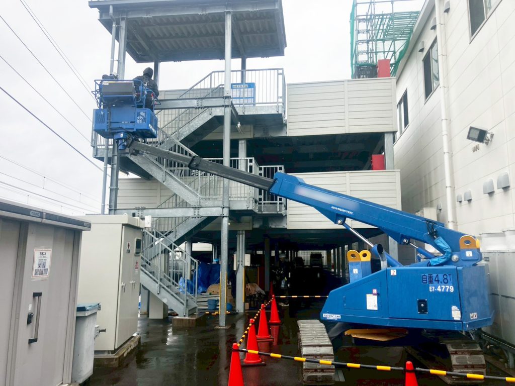 高さ制限2.1mを突破するため、キャタピラ型高所作業車を戦略的に投入しました。これにより、立体駐車場下を安全に潜り抜け、奥まったエリアでの架空配線作業および屋根上へのアクセスを可能にしました。現場環境に合わせた柔軟な機材選定をおこないました。